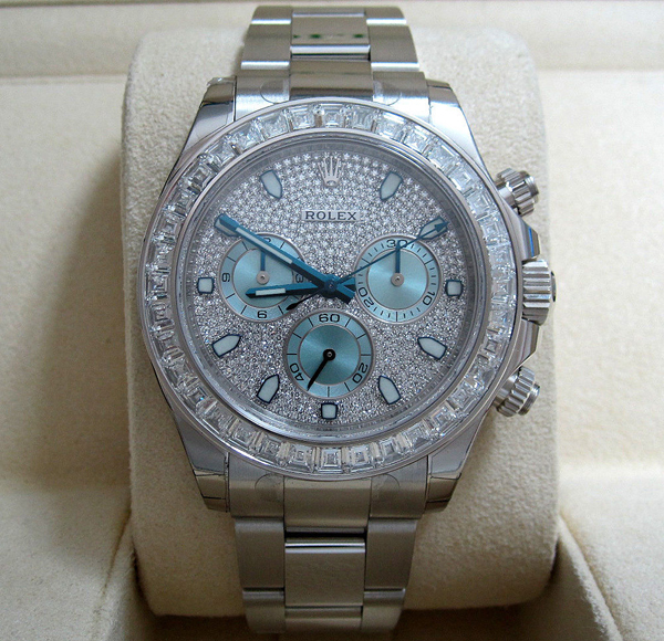 品名 コスモグラフ デイトナ型番 Ref.116576TBRケース プラチナダイアルカラー シルバームーブメント 自動巻き防水性能 100m防水サイズ ケース 40 mm(リューズ除く)ガラス サファイヤクリスタル風防仕様 クロノグラフ備考 2014年新バケットダイアモンドベゼル(計4.5カラット)パヴェダイアモンド文字盤ケース、ブレスレットともに付屬品 內外箱商品番號 ロレックス201517ベゼルに36個のバゲットダイヤモンドをセットしたプラチナ製のデイトナです。プラチナ専用色のアイスブルーをインダイヤルに用い、その他のダイヤル全面にダイヤモンドをセットし、見るからにゴージャスな一本になっていますデイトナ史上まれに見る豪華なモデルですので、スペシャルなジュエリーウォッチをお探しの方にお勧めします